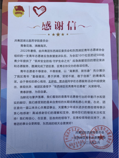本网讯(通讯员 张慧丽)近日,第一临床学院收到了来自共青团东西湖区委员会、东西湖区青年志愿者协会的感谢信,信中对2020级麻醉学1班的王伊晗、贾诗萌两名同学在应急救援宣讲活动中的突出成绩给予肯定,表扬其为青少年安全教育方面做出的勤奋努力。同时对学校注重培养向上向善、勇于拼搏的新时代好青年表示感谢。