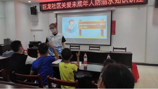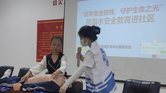 2022年7月,武汉迎来高温橙色预警。王伊晗、贾诗萌响应社区号召,积极参加“筑牢安全防线,守护生命之光”社区应急救援项目,在活动中带领青少年学习防溺水安全的相关知识,传授心肺复苏、海姆立克急救方法,将理论与实际结合,让学生们亲自上台体验急救过程,提升他们的安全意识和自救施救能力。