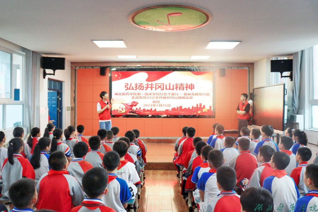 本网讯(通讯员 陈子珺 李占秋)5月31日下午,第一临床学院“红色千里行——壹麻先锋在行动”社会实践队在指导老师李占秋、学工办副主任孙小虎老师的带领下,前往十堰市张湾区东风43小学开展井冈山精神宣讲活动。