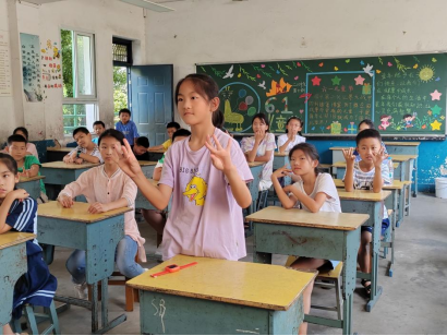 开班仪式结束后,志愿者们就积极参与到教学活动中,引导孩子们主动学习,培养孩子们的兴趣爱好。在音乐课上,队员张君怡带领大家一起合唱《歌唱祖国》,教室里旋律悠扬,热闹不凡。
