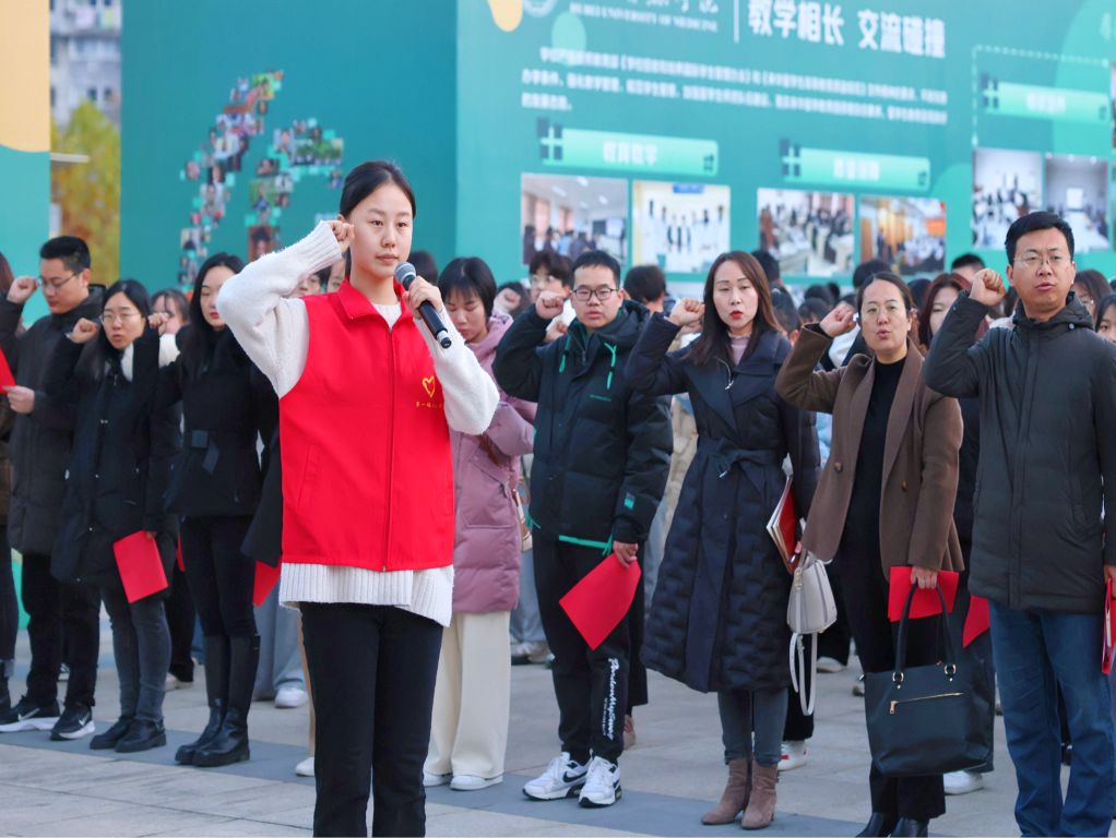 全国青年文明号——彩虹灾害医学救援志愿服务队代表闵旭彤,带领全体师生重温青年志愿者誓词,激励同学们继续践行“奉献、友爱、互助、进步”的志愿者精神。