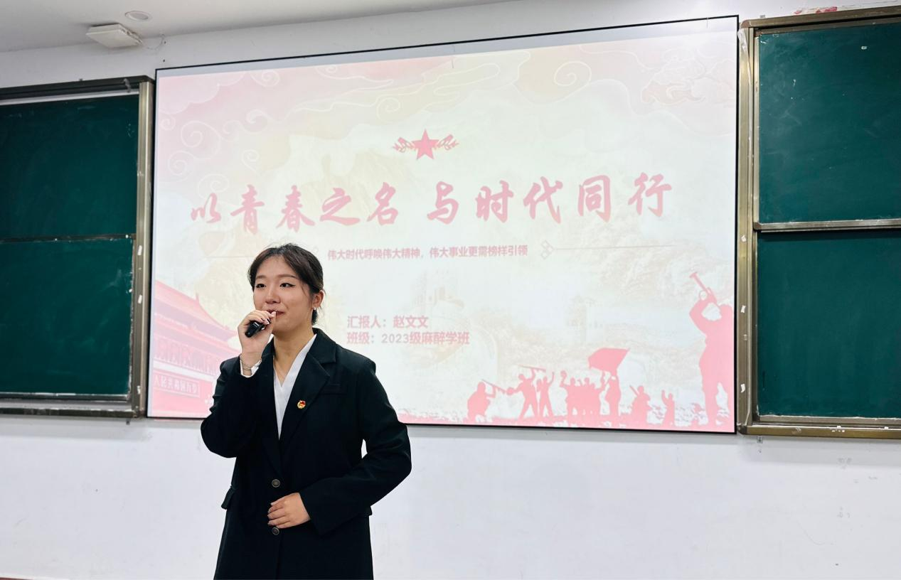 经过遴选后的七位同学依次上台演讲,他们满腔热血和饱满情感,诠释了青春对于个人与国家的深刻意义。赵文文以“抗美援朝中的英雄”导入,分享了自己作为志愿者的成长经历;王泽静则讲述了湖医药学子在四季变换中谱写的青春之歌,展现了新时代青年的奋斗姿态;鲁雅萱生动讲述了二汽建设者的故事,从个人小我到国家大家的视角,表达了她对于理想和信念的坚守。