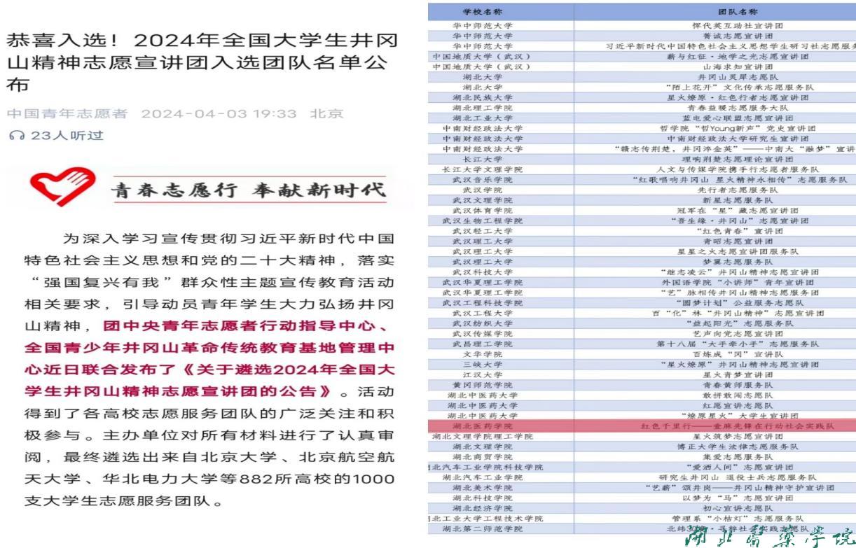 本网讯(通讯员 王家琛 陈思杨)近日,第一临床学院“红色千里行”社会实践队成功入选团中央“2024年全国大学生井冈山精神志愿宣讲团”。该实践队成立于2019年, 以“承思红色记忆,奋楫砥砺前行”为宗旨,以“挖掘红色故事,踏寻红色基地,弘扬红色精神”为目标开展宣讲活动。自成立以来,队员们的足迹遍布上海、武汉、井冈山、遵义、延安等革命圣地,致力于当好红色精神传播的先锋队。