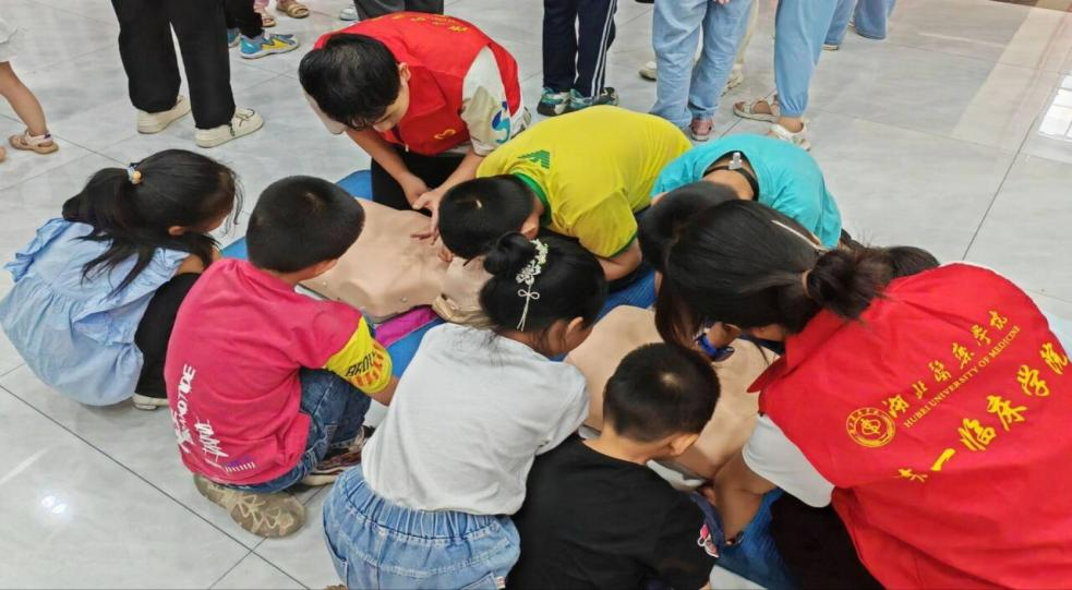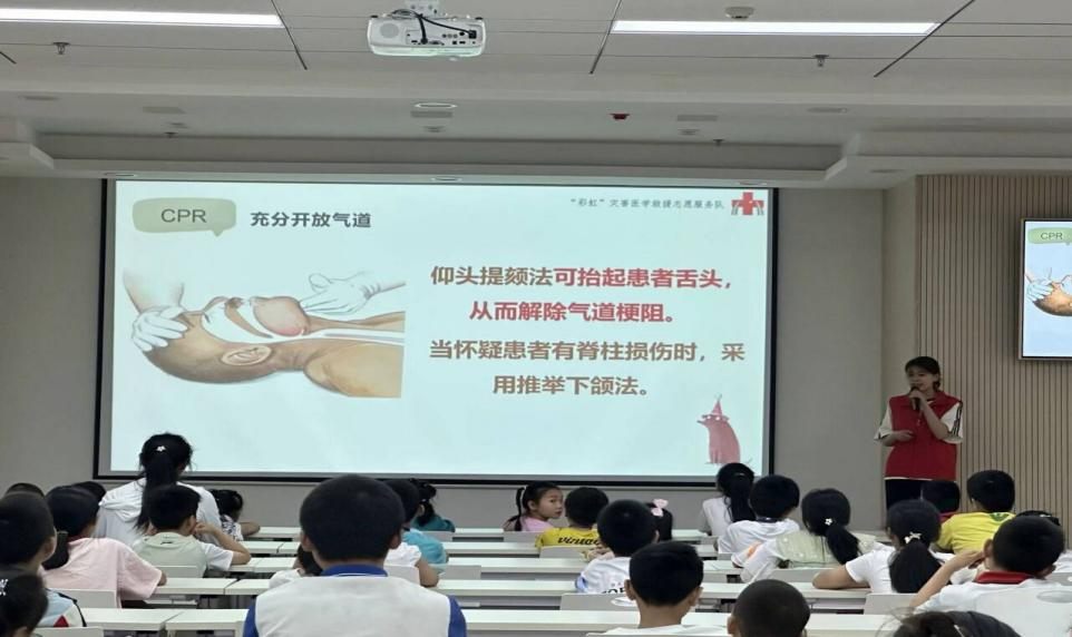 队员们通过防溺水知识讲解、心肺复苏展示、溺水自救演示等环节为孩子们上了一堂生动有趣的防溺水安全课。在趣味问答环节,同学们更是积极参与,争先恐后提问,现场气氛十分活跃。最后,队员们告诫小朋友们一定要提高安全防范意识,遇到溺水事件第一时间拨打120电话,队员们还手把手教孩子们如何进行心肺复苏,“你看,在胸骨中下三分之一处这里进行胸外按压,按压时要保持双臂伸直,用手掌发力”,队员们一边指导,一边随时纠正。