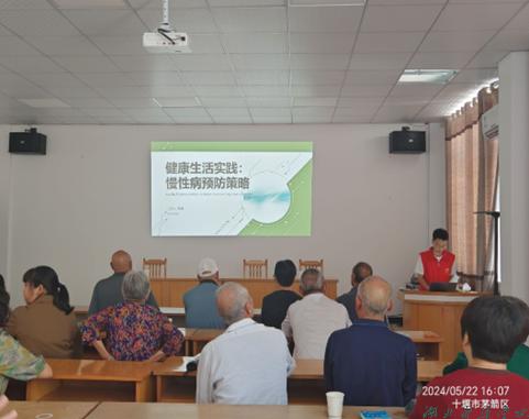 在讲座开展现场,另一队队员张鑫同学为老人们讲解了一些慢性疾病的预防策略,其中包括了慢性病的筛查与干预,健康生活习惯的建立,心里调节与压力管理,运动预防慢性病等,从多方面教会老人们如何预防慢性病。在为老人们科普结束后,队员也为老人们带来了一首“稳稳的幸福”,在活跃气氛的同时为老人们献上了最真诚的祝愿,希望他们健康快乐,幸福美满。