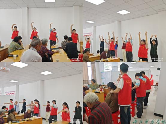 结合讲座中提到运动对预防慢性病的作用,志愿队队员们向老人们演示了健身气功“八段锦”的打法,并热情邀约老人们上前跟学,伴随着舒缓的音乐,不少老人站在队员身后跟着活动四肢舒展身体。音乐结束,参与到其中的老人们还意犹未尽,志愿队员主动进行动作指导,并向村民分享了八段锦教学视频。活动的最后,队员为老人们提供了按摩服务,为他们舒展了劳累的筋骨。
