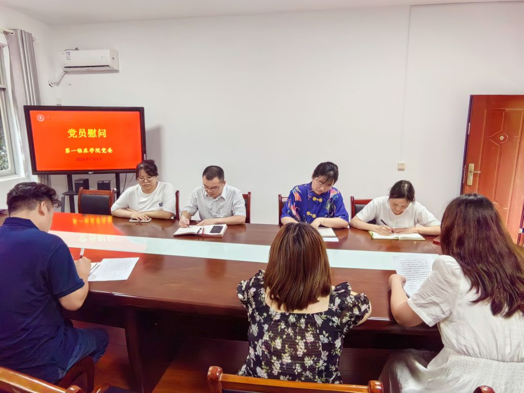本网讯(通讯员 洪敏)7月1日下午,第一临床学院在党员活动室开展了党员慰问送温暖活动。学院党委副书记龚小兵、学生党支部书记王冬梅、学生班级辅导员马珍珍以及学工办、团委负责老师参加慰问活动。