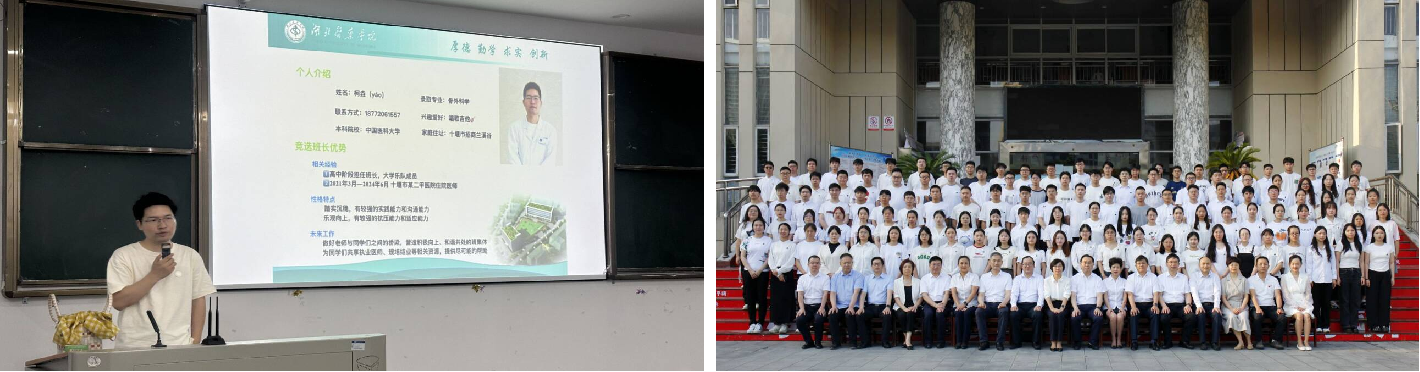 7月1日,新生报到,报道登记、核验新生提供材料、发放物资材料依次高效细致进行。新生班会必不可少,2021级研究生班长周愿为新生分享读研经验,建议同学们明确读研规划、牢记心中所向、紧紧把握当下。第一临床学院科研与研究生办公室主任涂梦薇老师组织同学们进行班委选举,柯垚、毕然等8名同学当选班委。7月2日,与全体在家校领导、院领导及直属附属太和医院教学办吴珍主任等领导老师合影留念,参加学校举行的2024级研究生开学典礼。