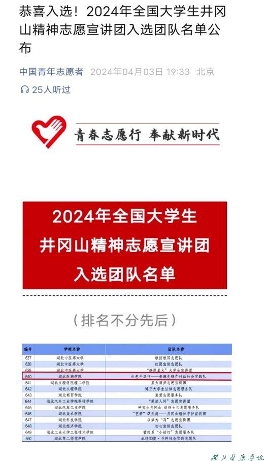 本网讯(通讯员 姜慧林 潘金戈)近日,团中央青年志愿者行动指导中心、中国青年志愿者协会公布了2024年全国大学生井冈山精神志愿宣讲团优秀团队名单, 第一临床学院红色千里行社会实践队被评为优秀团队,成功进入全国百优团队行列。