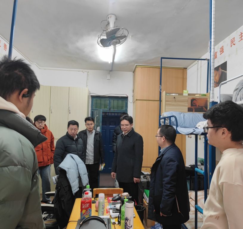2月17日晚,学院院长唐以军、党委书记邵义光、党委副书记龚小兵带领辅导员走访学生寝室,与同学们亲切交流,了解假期生活、返校情况和新学期规划,现场协调解决学生关于学习和生活上的困难。