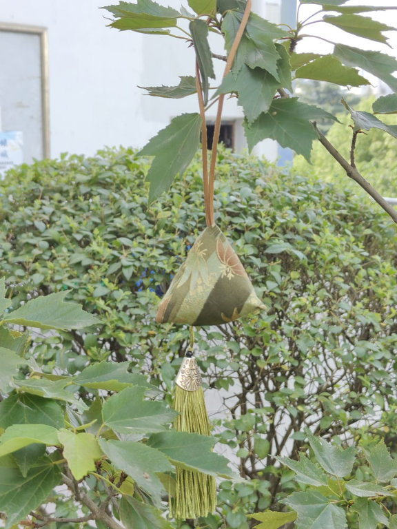 当第一个虎头香囊诞生时,教室里爆发出掌声—— 那虎头绣得憨态可掬,眼睛是两颗黑纽扣,尾巴上还缀着铃铛。“这要是挂在书包上,保准辟邪!” 一位同学晃着香囊,铃铛声清脆得像串小水珠。夕阳斜斜切进教室时,每个人的书包上都晃着个香囊,艾草混着陈皮的香,随着走动轻轻漫出来,像是给空气织了层温柔的网。