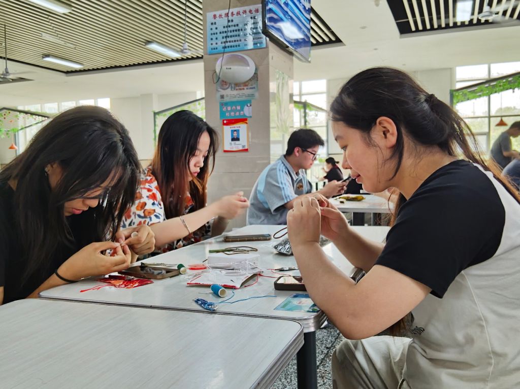 “穿针要像这样,顺着光看针眼。” 团支书侯欣玮举着绣绷示范,阳光在她发梢跳成金斑。“完了,我把‘平安’绣成‘平女’了!” 后排男生举着绣布哀嚎,惹得周围人笑倒一片。有人用剩下的碎布做小粽子挂饰,有人往香囊里多塞了把薄荷,说是 “要把夏天的清凉都装进去”。侯欣玮挨个给新手们递线团,看见有人把香囊缝成了歪歪扭扭的三角形,忍不住笑出酒窝:“甭担心,心意歪不了就行!”