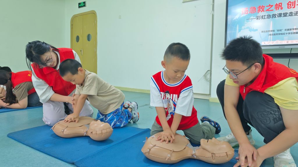 活动现场,“彩虹”队员们化身“急救导师”,围绕心肺复苏术、手部八字包扎等实用急救技能展开教学。队员们首先进行标准化操作演示,从心肺复苏的按压部位、频率、深度,到手部包扎的绷带缠绕技巧,每一个动作都细致规范。讲解环节,队员们用通俗易懂的语言,拆解操作关键步骤,让孩子们清晰理解急救原理,确保他们能“看得懂、记得住、用得上” 。