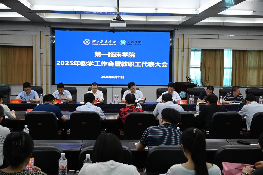 本网讯(通讯员 姚莉)6月11日下午,第一临床学院在直属附属太和医院六楼会议室召开2025年教学工作会暨教职工代表大会。第一临床学院院长、附属太和医院党委书记、院长唐以军,第一临床学院党委书记、常务副院长邵义光以及校人事处负责人、学院领导班子成员、各办负责人、教职工代表参加会议。会议由邵义光书记主持。