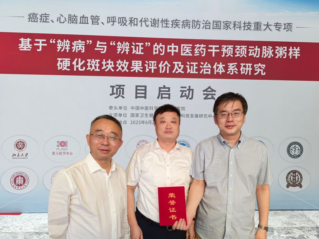 本网讯(通讯员 杨慧君)6月29日,由科技部、国家卫健委、国家中医药管理局联合推动的"癌症、心脑血管、呼吸和代谢性疾病防治国家科技重大专项"——《基于"辨病"与"辨证"的中医药干预颈动脉粥样硬化斑块效果评价及证治体系研究》(项目编号:2024ZD0528200)在北京启动。我校康复医学系教师谢谨作为项目核心成员单位负责人受邀参会,并代表附属太和医院接受专项授牌。