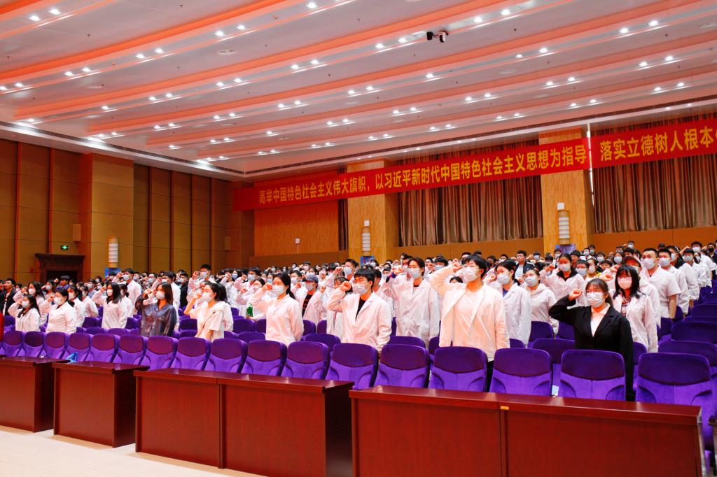 王明华副院长领诵医学生誓词,同学们高握右拳,郑重承诺,慷慨洪亮的声音在宣告他们有信心和决心做一名优秀的医学生,为祖国医药卫生事业的发展和人类身心健康奋斗终生。