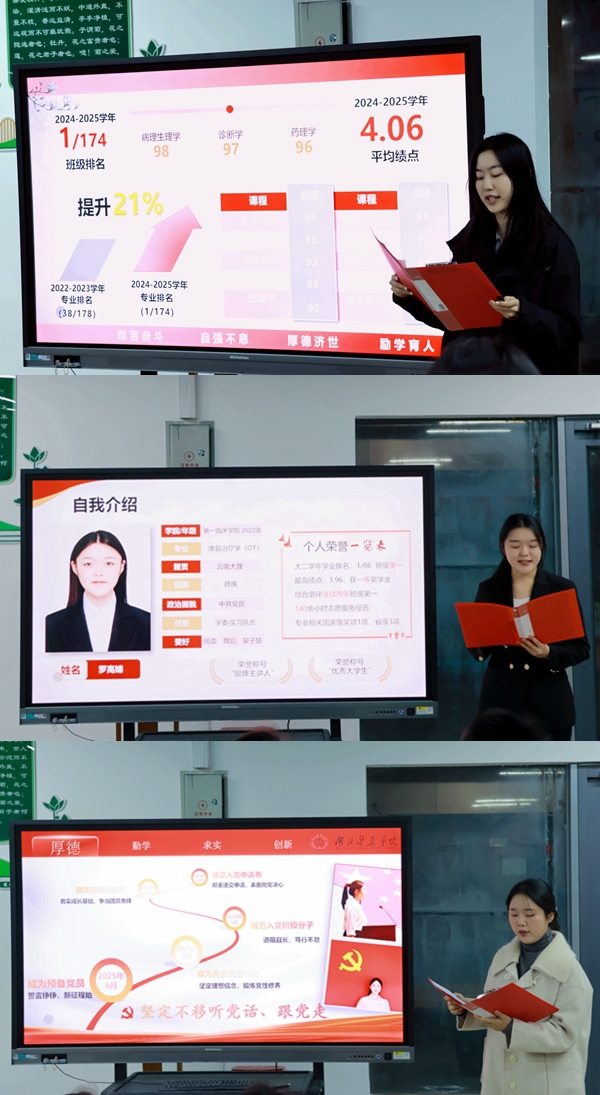 第一临床学院学生第二党支部2022级麻醉学班的周萱同学以“奋斗为笔谱写青春华章”为主题,结合学习生活实例,合理分配时间管理技巧,用通俗易懂的话语将“优先级分类法”“碎片化时间利用”等好的学习方法传授给大家,为同学解决时间规划难题;支部2022康复治疗学班(OT方向)的罗高婧同学围绕“流水不争先,争滔滔不绝”,从“角色”一词出发,分享如何平衡学业、实践、科研等不同活动之间精力投入的经验,倡导同学们全面发展;支部2023麻醉学班的王泽静同学以“追风赶月莫停留,平芜尽处是春山”为主题,结合自身勇于打破自我去探索、于一次次社会实践中提升自我,鼓励大家突破舒适圈,培养不怕试错敢闯敢拼的精神。
