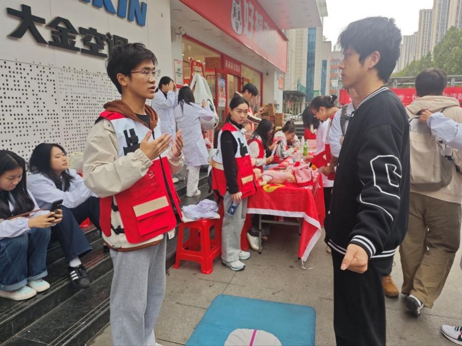 11月29日,服务队走进药护学院郧阳校区,针对青年学生群体的生活习惯与健康需求,活动聚焦急救知识普及,设置了心肺复苏(CPR)实操体验、AED使用教学等板块。在急救实操区,队员们手把手指导学生进行心肺复苏模拟训练,纠正动作细节,确保每一位参与者都能掌握相关技能。