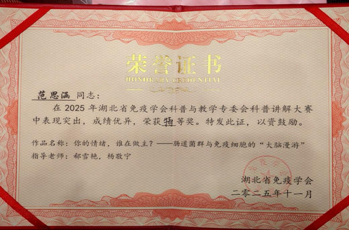 本网讯(通讯员王冬梅、范思涵)2025年11月29日,湖北省免疫学会科普讲解大赛决赛在武汉市亚心总医院圆满收官。来自湖北医药学院第一临床学院2024级麻醉学班的范思涵,凭借作品《你的情绪,谁在做主?——肠道菌群与免疫细胞的“大脑漫游”》斩获大赛特等奖。